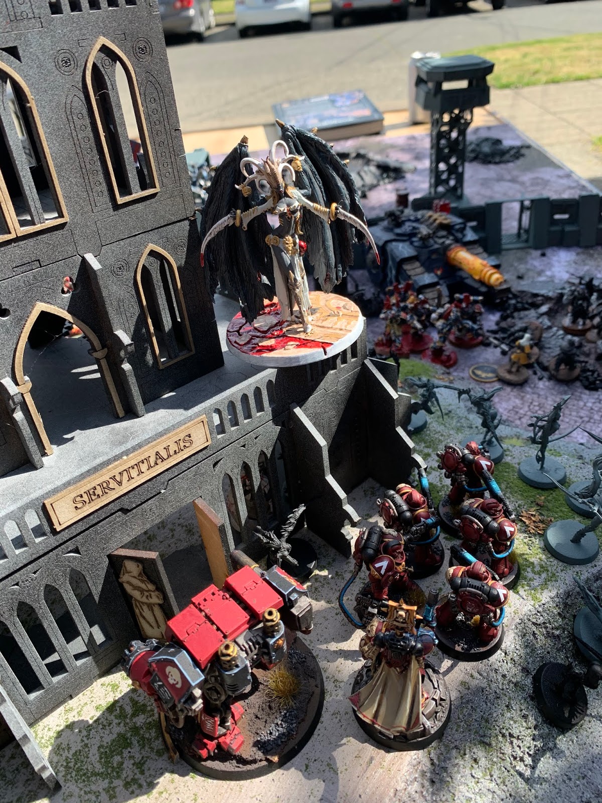 My opponent brought a whole cadre of Night Lords whose leader had succumbed to the temptations of Slaanesh. Every base was drenched in blood, and every character was adorned with skulls and skin. Needless to say, I was super excited to destroy them. It is so great to fight against genuine villains.